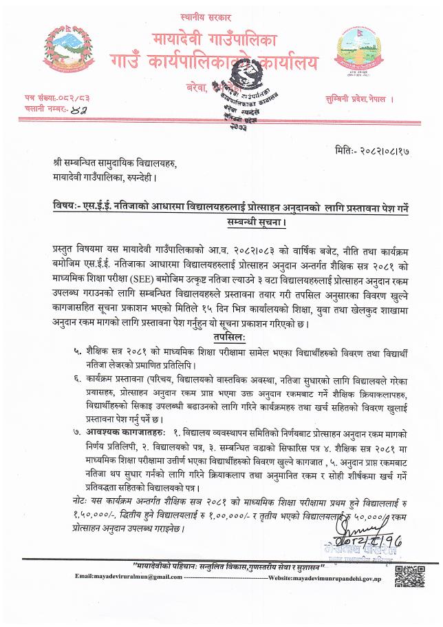 » एस.ई.ई. नतिजाको आधारमा विद्यालयहरुलाई प्रोत्साहन अनुदानको लागि प्रस्तावना पेश गर्ने सम्बन्धी सूचना - मायादेवी गाउँपालिका, बरेवा-रुपन्देही ।