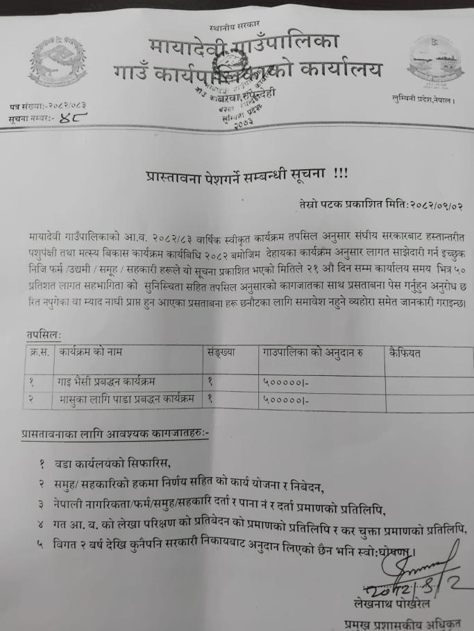 माछापालक कृषकहरुका लागि प्रोवाइटिक वितरण कार्यक्रम सम्बन्धी सूचना - मायादेवी गाउँपालिका, बरेवा-रुपन्देही ।