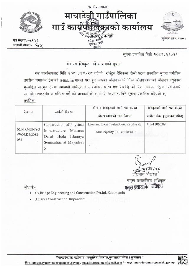 बोलपत्र स्विकृत गर्ने आशयको सूचना - मायादेवी गाउँपालिका, बरेवा-रुपन्देही ।