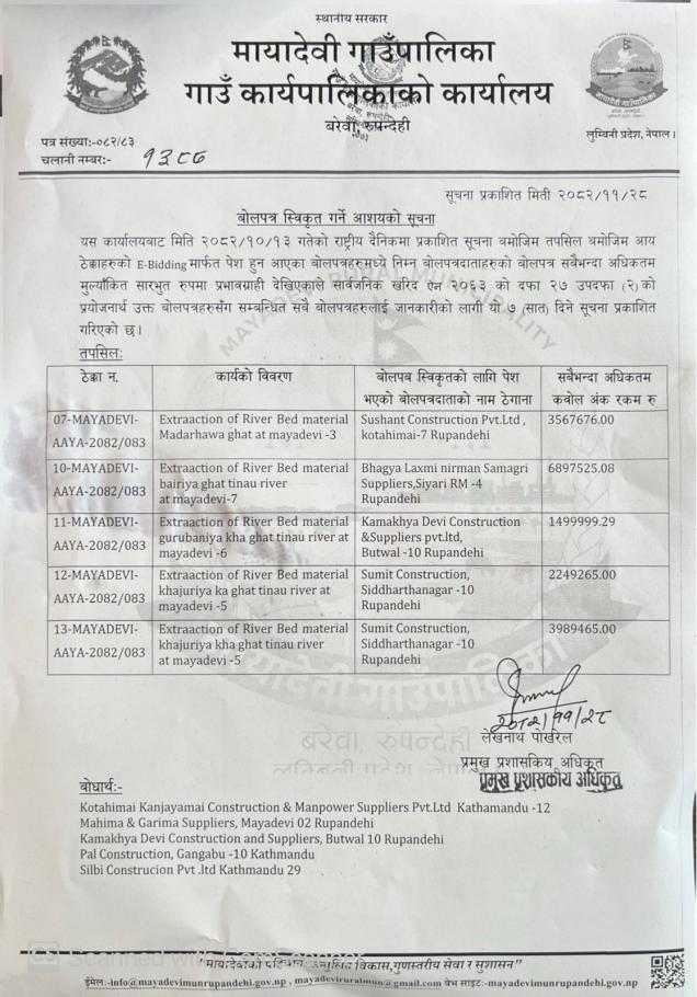 बोलपत्र स्विकृत गर्ने आशयको सूचना - मायादेवी गाउँपालिका, बरेवा-रुपन्देही ।