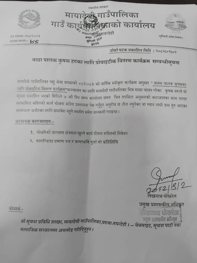 माछापालक कृषकहरुका लागि प्रोवाइटिक वितरण कार्यक्रम सम्बन्धी सूचना - मायादेवी गाउँपालिका, बरेवा-रुपन्देही ।