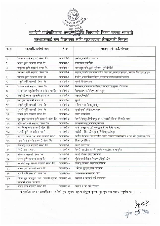 यरिया मल ल्याई वितरण गर्ने सम्बन्धमा - मायादेवी गाउँपालिका, बरेवा-रुपन्देही ।