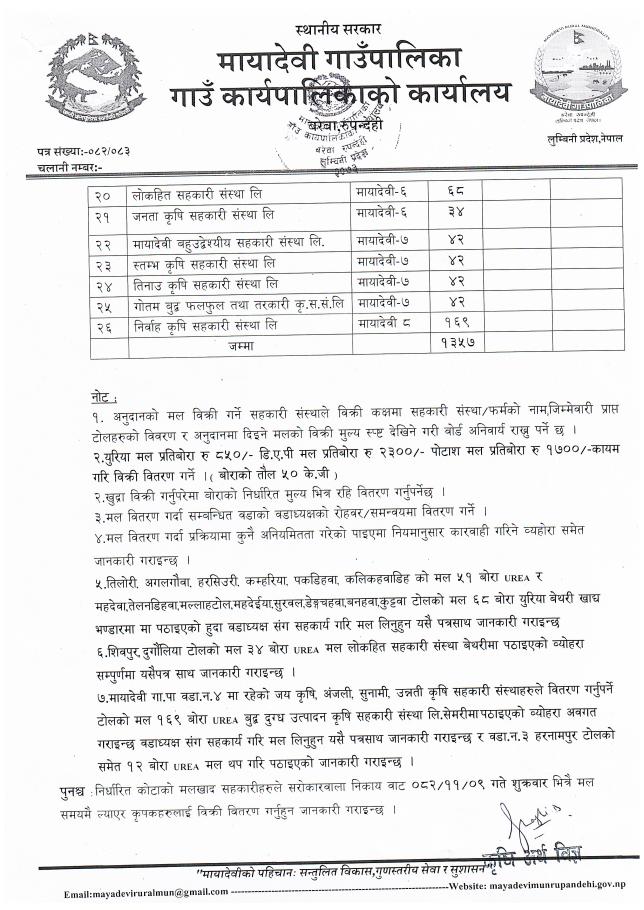 युरिया मल ल्याई वितरण गर्ने सम्बन्धमा - श्री सरोकारवाला सबै, मायादेवी गाउँपालिका, बरेवा-रुपन्देही ।