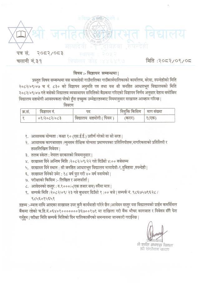 विज्ञापन सम्बन्धमा - श्री जनहित आधारभुत विद्यालय, मायादेवी-१, दुविहवा, रुपन्देही ।