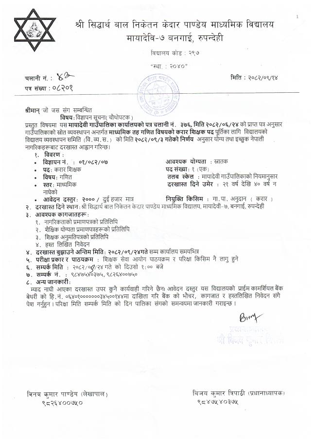 विज्ञापन सूचना ( चौथोपटक) - श्री सिद्धार्थ बाल निकेतन केदार पाण्डेय माध्यमिक विद्यालय मायादेवी-७ बनगाई, रुपन्देही ।
