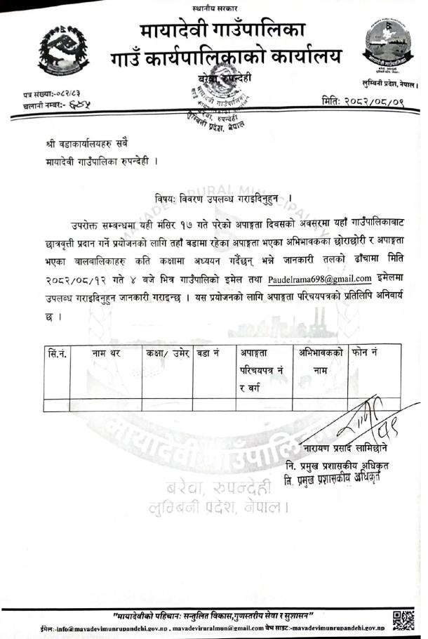 विवरण उपलव्ध गराइदिनुहुन - श्री वडा कार्यालय सबै, मायादेवी गाउँपालिका, रुपन्देही ।