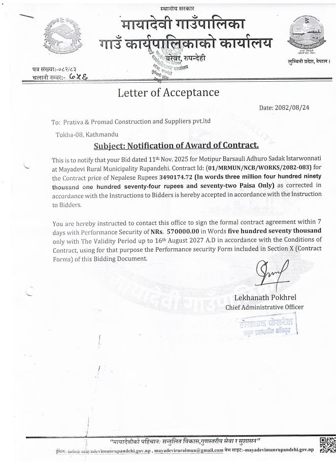 LETTER OF ACCEPTANCE - PRATIVA & PRAMOD CONSTRUCTION AND SUPPLIERS PVT.LTD., TOKHA-8,KTM .