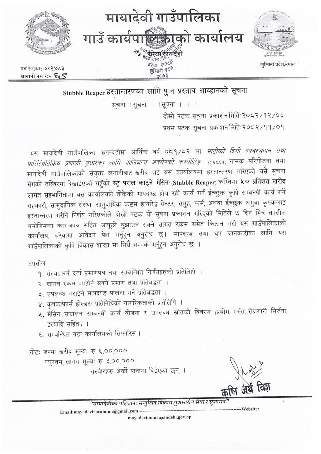 Stubble Reaper हस्तान्तरणका लागि प्रस्ताव आव्हानको सूचना (दोश्रो पटक सूचना प्रकाशन मितिः२०८२/१२/०६) - श्री मायादेवी गाउँपालिका, बरेवा-रुपन्देही ।