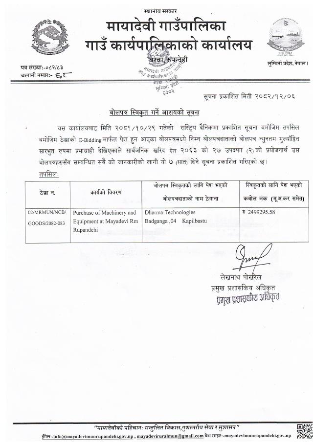 » बोलपत्र स्विकृत गर्ने आशयको सूचना - मायादेवी गाउँपालिका, बरेवा-रुपन्देही ।