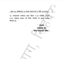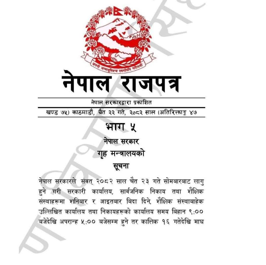 कार्यालय समयबारे राजपत्रमा प्रकाशित सूचना । मिति २०८२ चैत्र २३ गतेदेखि लागू हुने गरी - कार्यालय समयः बिहान ९:०० बजेदेखि अपरान्ह ५:०० बजेसम्म (शैक्षिक संस्थाबाहेक) - शनिबार र आइतबार सार्वजनिक बिदा (सरकारी कार्यालय, सार्वजनिक निकाय तथा शैक्षिक संस्थाहरु