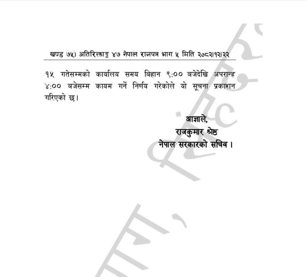 Home » कार्यालय समयबारे राजपत्रमा प्रकाशित सूचना । मिति २०८२ चैत्र २३ गतेदेखि लागू हुने गरी - कार्यालय समयः बिहान ९:०० बजेदेखि अपरान्ह ५:०० बजेसम्म (शैक्षिक संस्थाबाहेक) - शनिबार र आइतबार सार्वजनिक बिदा (सरकारी कार्यालय, सार्वजनिक निकाय तथा शैक्षिक संस्थाहरु