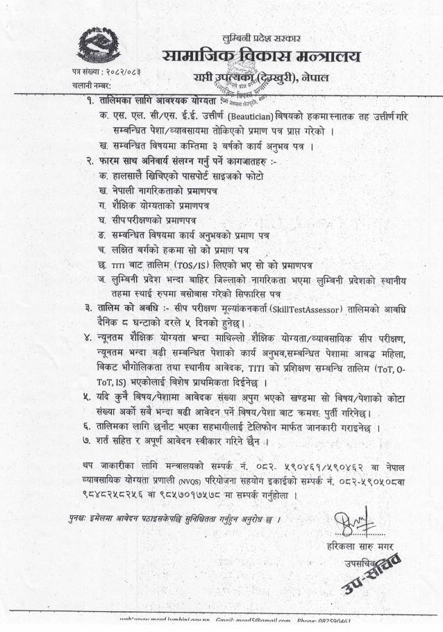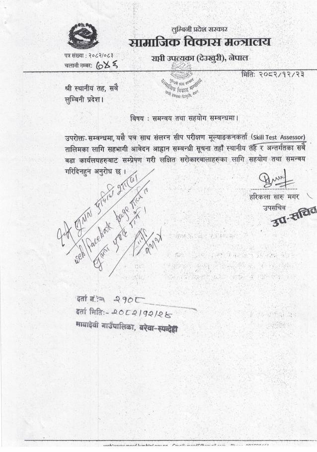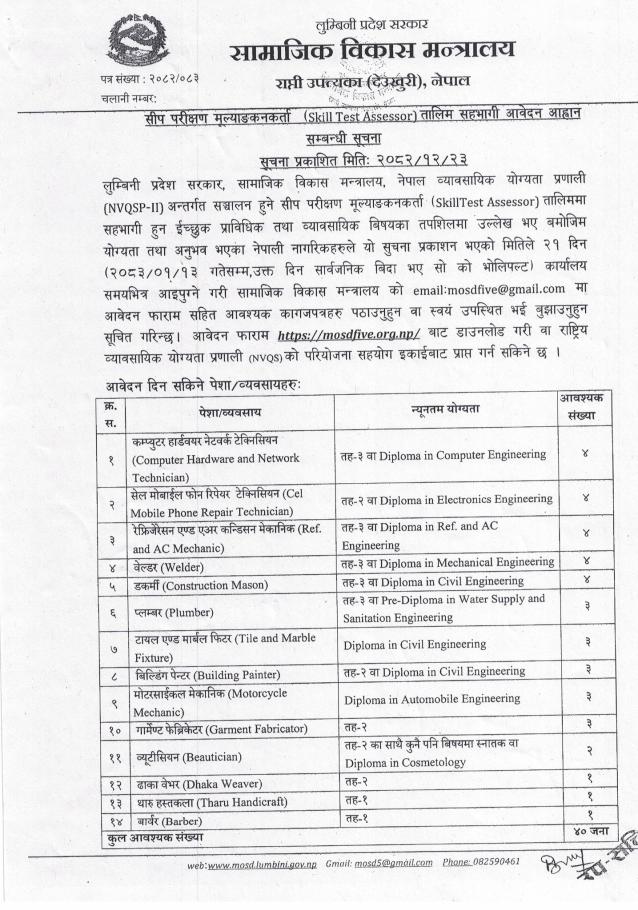सीप परीक्षण मल्याङकनकर्ता (Skill Test Assessor) तालिम सहभागी आवेदन आह्वान सम्बन्धी सूचना - सामाजिक विकास मन्त्रालय, राप्ती उपत्यका (देउखुरी), नेपाल ।