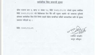 लुम्बिनी प्रदेश सरकार, आन्तरिक मामिला तथा कानुन मन्त्रालय, राप्ती उप्तयका (देउखुरी)को चैते दशैं (शुक्ल अष्टमी) को अवसरमा सार्वजनिक विदा सम्बन्धी सूचना !!!
