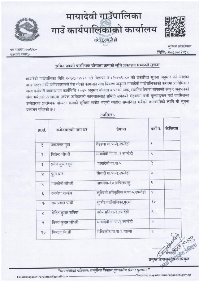 अमिन पदको प्रारम्भिक योग्यता क्रमको सूचि प्रकाशन सम्बन्धी सूचना - मायादेवी गाउँपालिका, बरेवा-रुपन्देही ।
