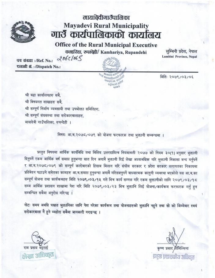 आ.व.२०७८/७९ को योजना फरफारक तथा भुक्तानी सम्बन्धमा - आर्थिक प्रशासन शाखा,मायादेवी गा.पा.