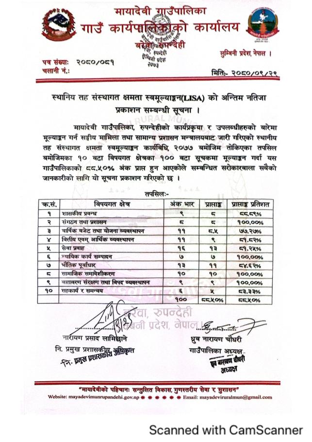 आ.व. २०८९/०८० को स्थानिय तह संस्थागत क्षमता स्वमूल्याङ्कन (LISA) को अन्तिम नतिजा प्रकाशन सम्बन्धी सूचना - मायादेवी गाउँपालिका, बरेवा-रुपन्देही ।