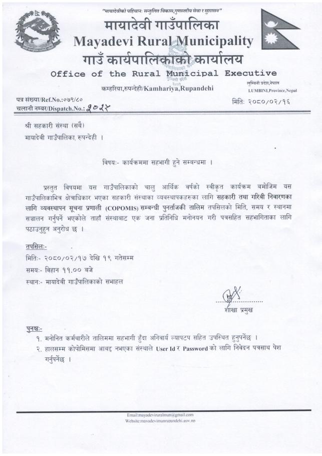 कार्यक्रममा सहभागी हुने सम्बन्धमा (श्री सहकारी संस्था सबै)- मायादेवी गाउँपालिका, बरेवा-रुपन्देही ।