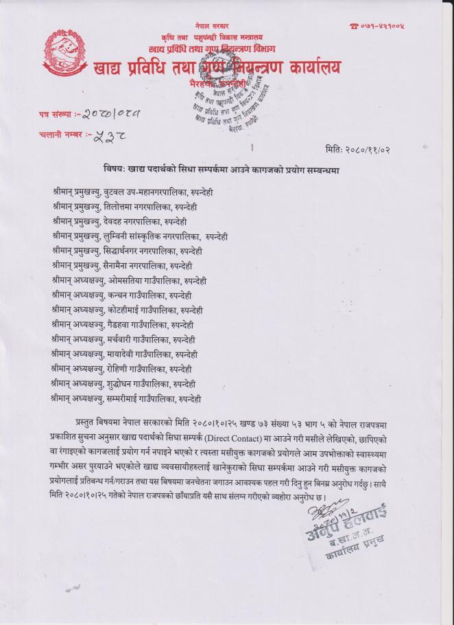 खाद्य प्रविधि तथा गुण नियन्त्रण कार्यालय, भैरहवा-रुपन्देहीको खाद्य पदार्थको सिधा सम्पर्कमा आउने कागजको प्रयोग सम्बन्धी सूचना