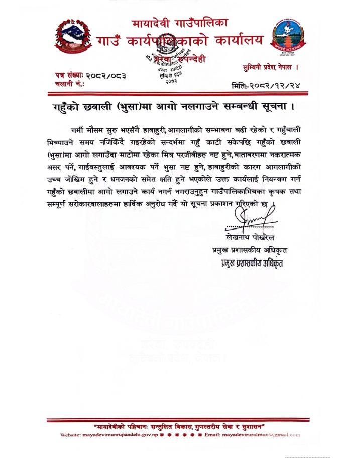 गहुँको छवाली (भुसा)मा आगो नलगाउने सम्बन्धी सूचना !!! - मायादेवी गाउँपालिका, बरेवा, रुपन्देही ।