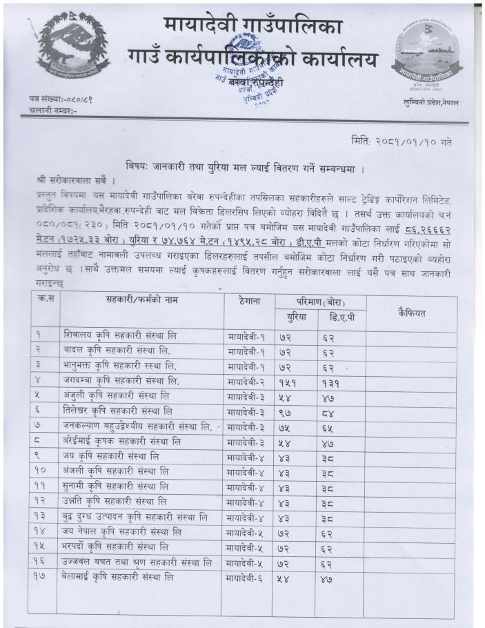 जानकारी तथा युरिया मल ल्याई वितरण गर्ने सम्बन्धमा - श्री सरोकारवाला सबै, मायादेवी गाउँपालिका, बरेवा-रुपन्देही ।