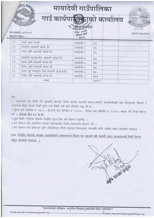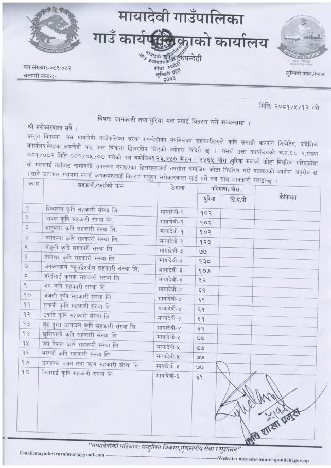 जानकारी तथा युरिया मल ल्याई वितरण गर्ने सम्बन्धमा - श्री सरोकारवाला सबै, मायादेवी गाउँपालिका, रुपन्देही ।