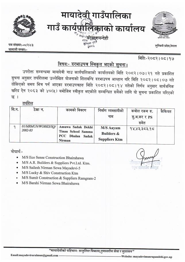 बोलपत्र स्वीकृती गर्ने आशय सम्बन्धी सूचना - मायादेवी गाउँपालिका, बरेवा-रुपन्देही ।