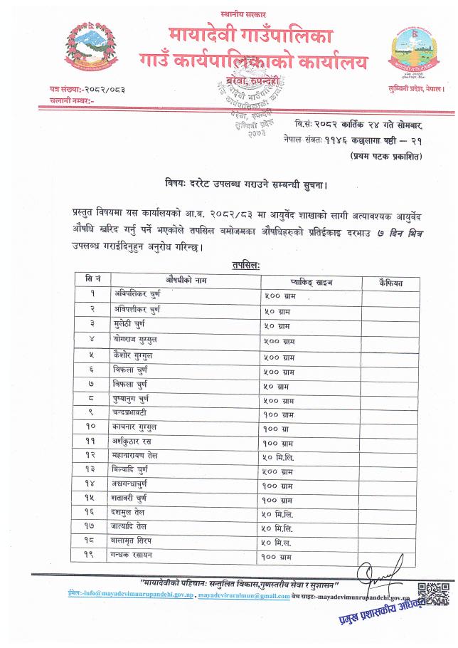» दररेट उपलब्ध गराउने सम्बन्धी सूचना - मायादेवी गाउँपालिका, बरेवा-रुपन्देही ।