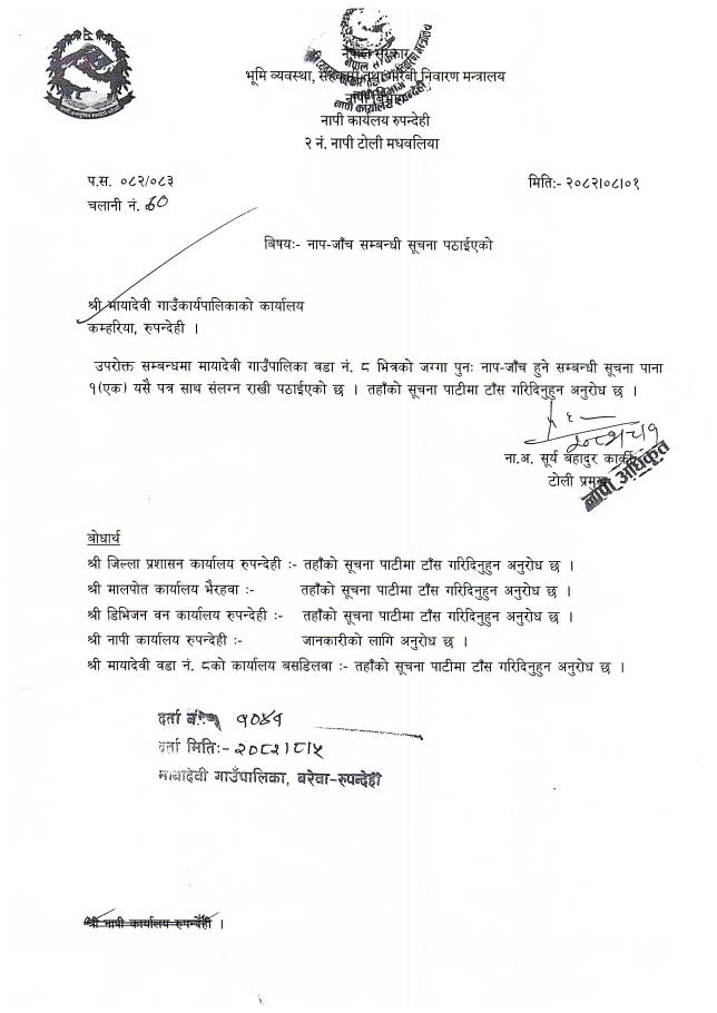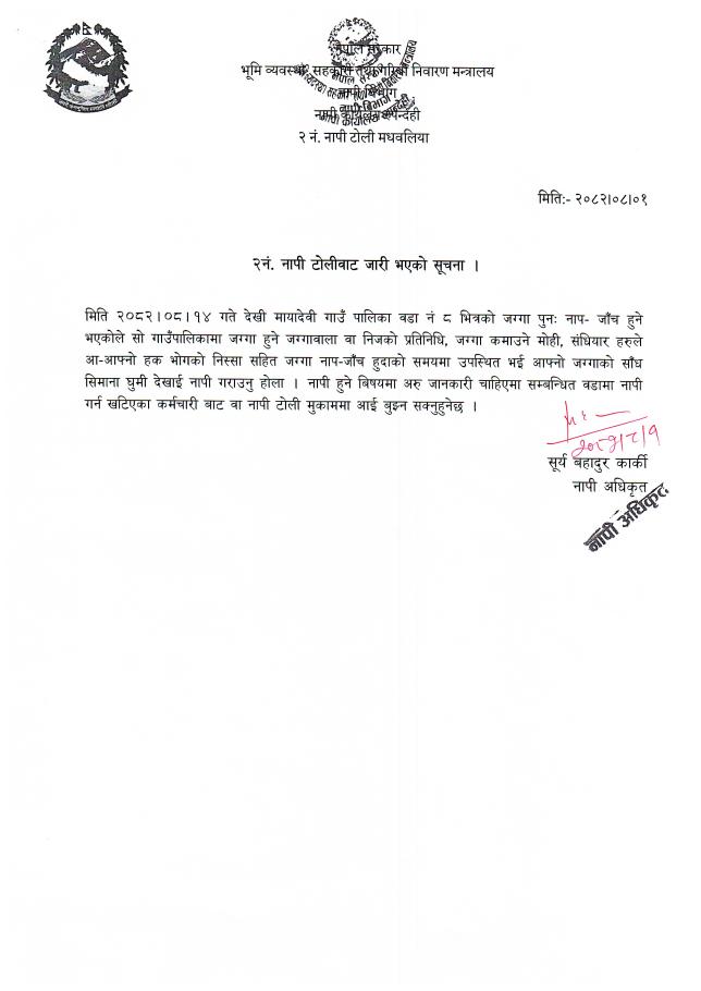 नापी कार्यालय, रुपन्देही, २ नं. नापी टोली, मधवलियाद्वारा मिति २०८२/०८/०१ गते प्रकाशित नाप-जाँच सम्बन्धी सूचना