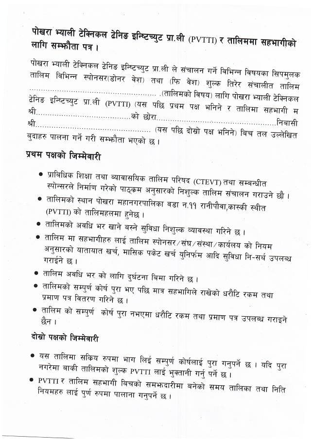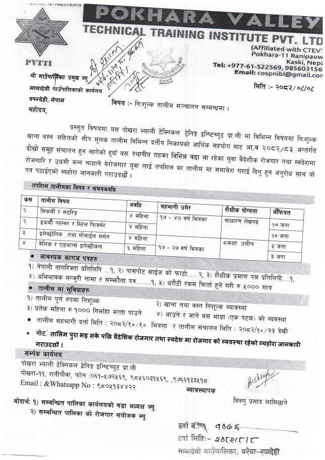 निःशुल्क तालीम संचालन सम्बन्धी पोखरा भ्याली टेक्निकल ट्रेनिङ इनस्टिच्युट प्रा.लि.को सूचना