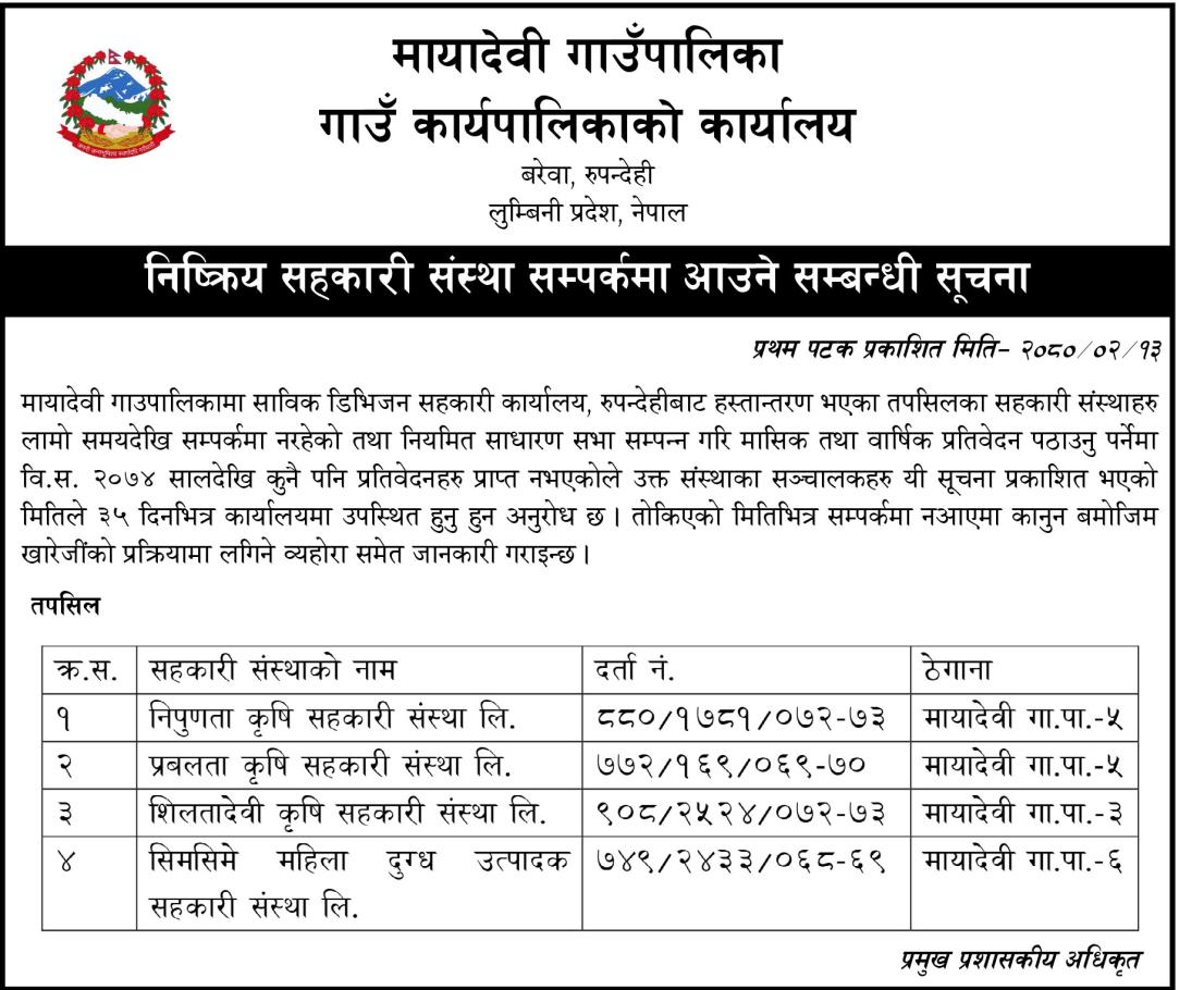 » निष्क्रिय सहकारी संस्था सम्पर्कमा आउने सम्बन्धी सूचना - मायादेवी गाउँपालिका, बरेवा-रुपन्देही ।