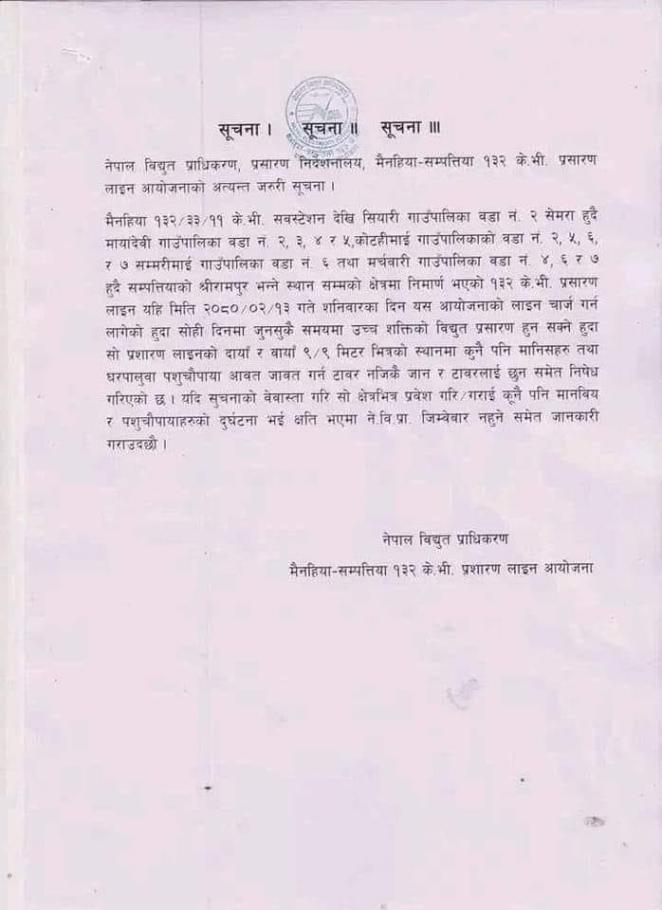 नेपाल विद्युत प्राधिकरण मैनहिया-सम्पतिया १३२ के.भी. प्रशारण लाइन आयोजनाको अत्यन्त जरुरी सूचना !