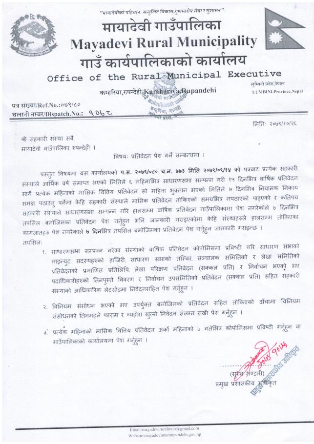 प्रतिवेदन पेश गर्ने सम्बन्धमा - सहकारी शाखा,मायादेवी गाउँपालिका,रुपन्देही ।