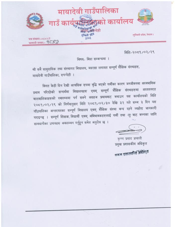 बिदा सम्बन्धमा - श्री सामुदायिक तथा संस्थागत बिद्यालय, मदरसा लगायत सम्पूर्ण शैक्षिक संस्थाहरु, मायादेवी गाउँपालिका, बरेवा-रुपन्देही ।