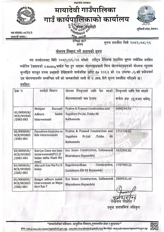 बोलपत्र स्विकृत गर्ने आशयको सूचना - मायादेवी गाउँपालिका, बरेवा-रुपन्देही ।