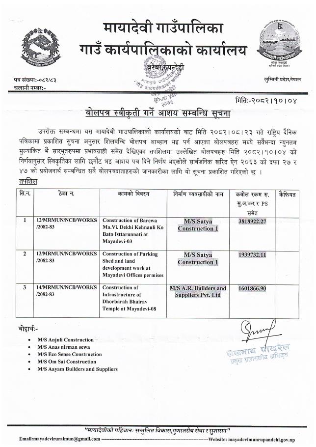 बोलपत्र स्वीकती गर्ने आशय सम्बन्धि सूचना - मायादेवी गाउँपालिका, बरेवा-रुपन्देही ।
