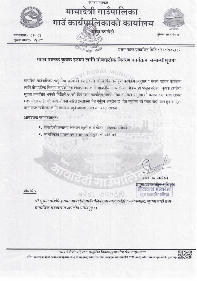 माछापालक कृषकहरुका लागि प्रोबायोटिक वितरण कार्यक्रम सम्बन्धी सूचना !!!