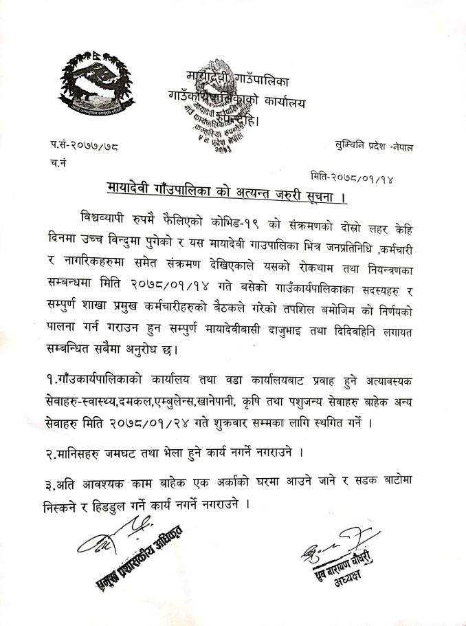 मायादेवी गाउँपालिकाको कोभिड - १९ को संक्रमणको दोस्रो लहर सम्बन्धि अत्यन्त जरुरी सुचना