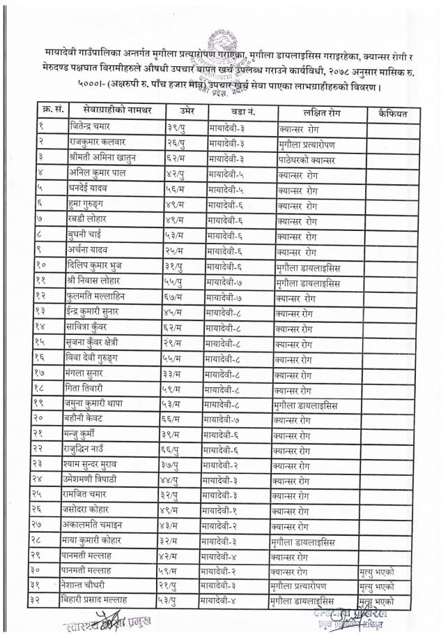मायादेवी गाउँपालिका अन्तर्गत मृगौला प्रत्यारोपण गरेका, मृगौला डायलाइसिस गराइरहेका, क्यान्सर रोगी र मेरुदण्ड पक्षघात बिरामीहरुले औषधी उपचार बापत खर्च उपलब्ध गराउने कार्यविधी, २०७८ अनुसार मासिक रु. ५०००/- (पाँच हजार) उपचार खर्च पाएका लाभग्राहीहरुको विवरण !