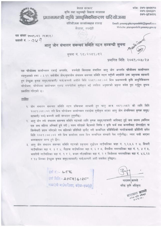 मितिः २०८१/०७/२७ गते प्रधानमन्त्री कृषि आधुनिकीकरण परियोजना, भैरहवा-रुपन्देहीद्वारा प्रकाशित आलु जोन संचालन समन्वय समिति गठन सम्बन्धी सूचना