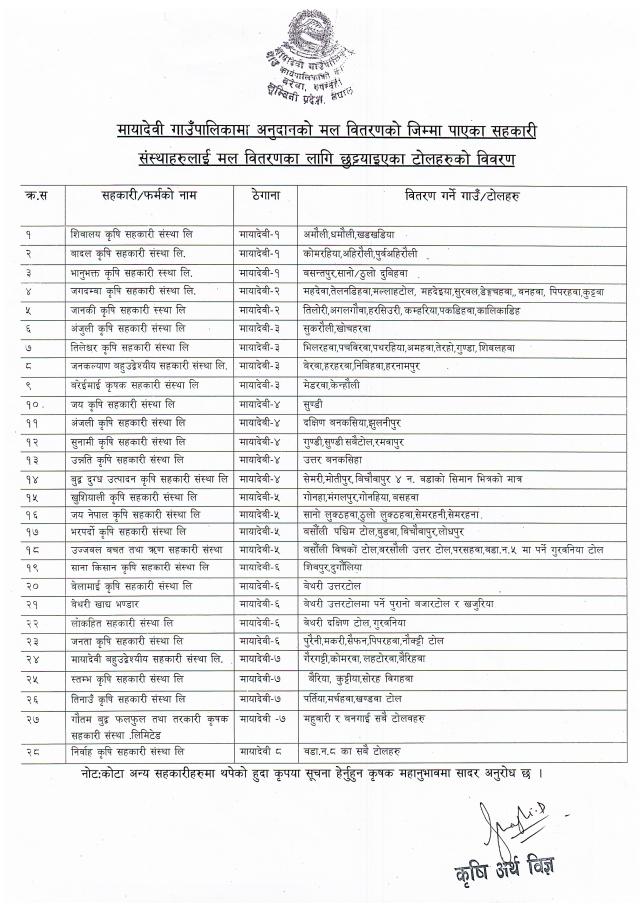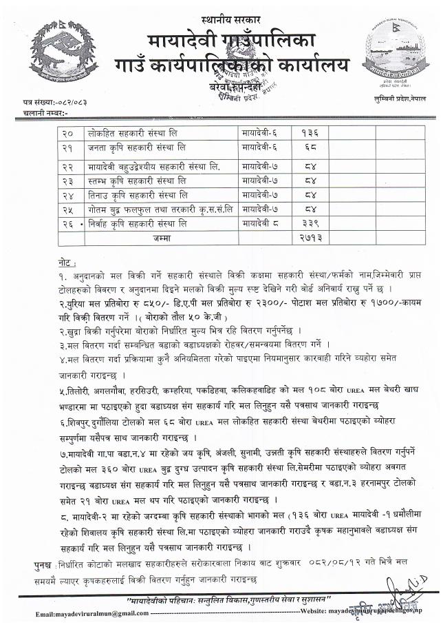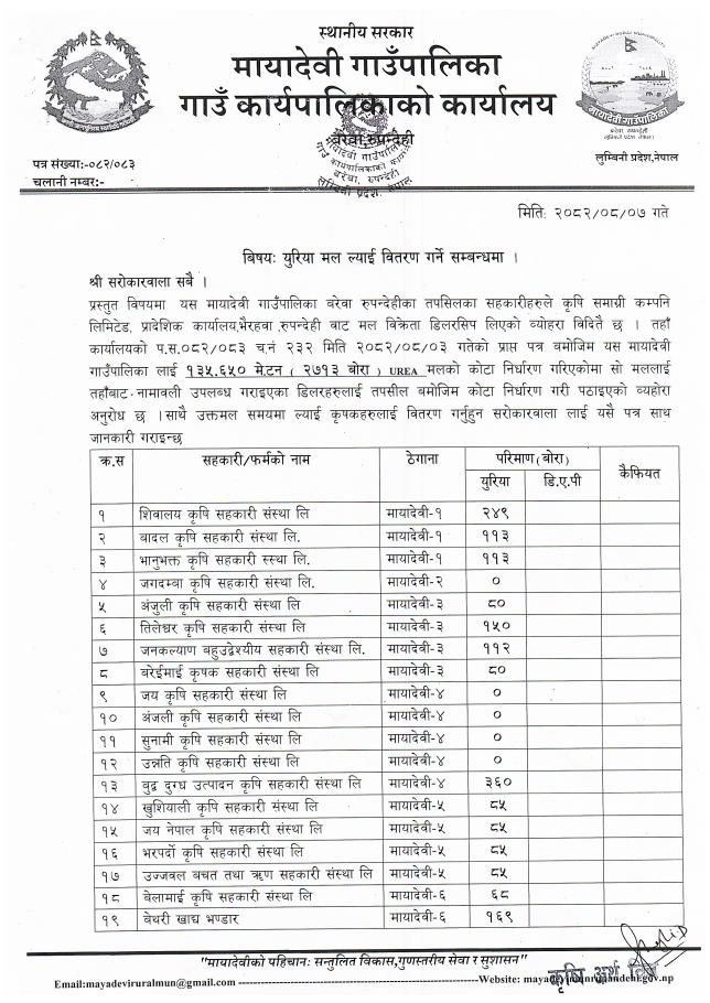 युरिया मल ल्याई वितरण गर्ने सम्बन्धमा - मायादेवी गाउँपालिका, बरेवा-रुपन्देही ।