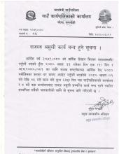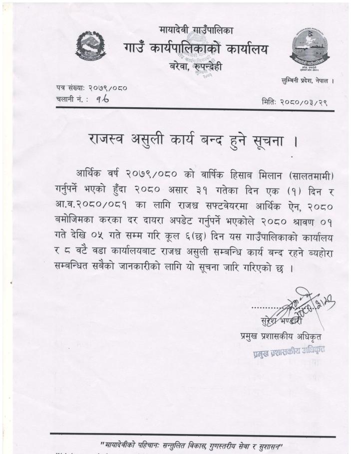 राजश्‍व असुली कार्य बन्द हुने सूचना - मायादेवी गाउँपालिका, बरेवा-रुपन्देही ।