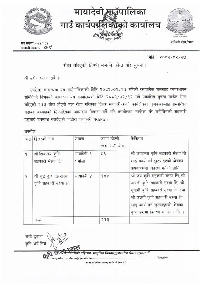 रोक्का गरिएको डि.ए.पी. मलको कोटा बारे सूचना - मायादेवी गाउँपालिका, बरेवा-रुपन्देही ।