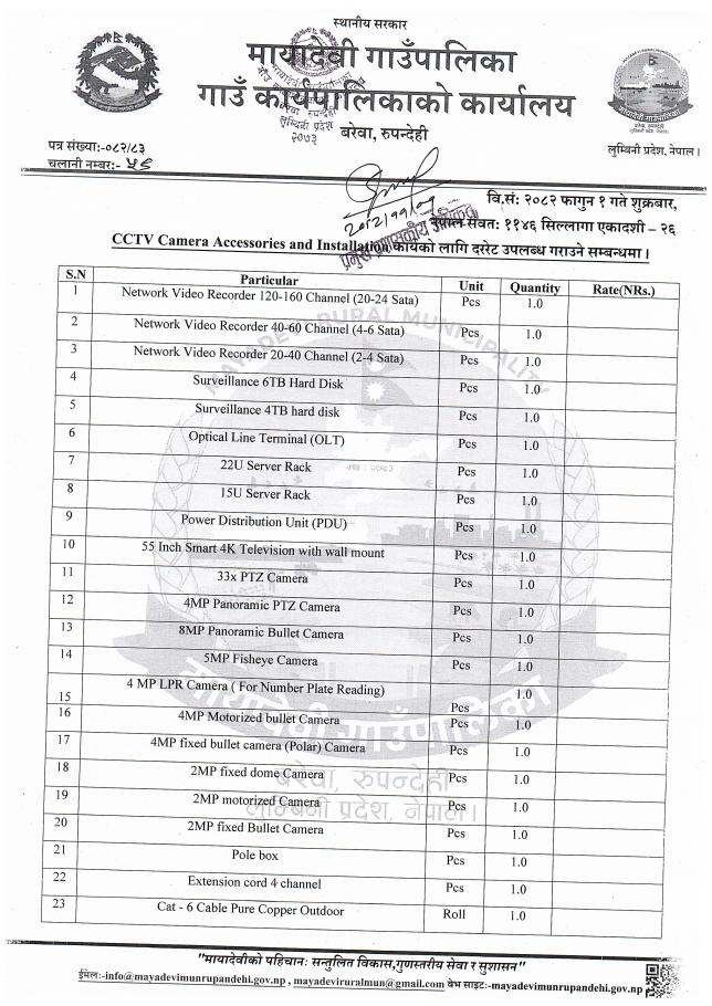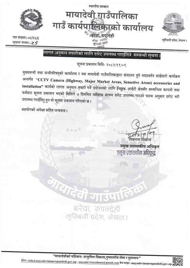 INVITATION FOR BIDS (D.O.F.P. :- 06,Feb, 2026) - Mayadevi Rural Municipality, Barewa, Rupandehi.