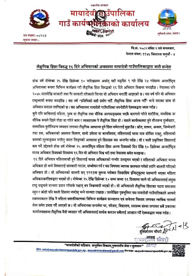 » लैङ्गिक हिसा विरुद्ध १६ दिने अभियानको अवसरमा मायादेवी गाउँपालिकाद्वारा जारी सन्देश - मायादेवी गाउँपालिका, बरेवा-रुपन्देही ।