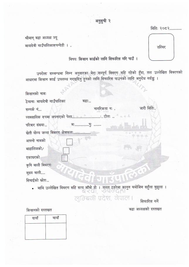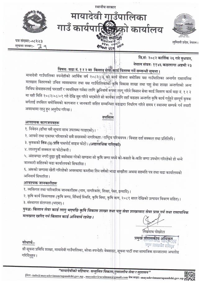 वडा नं. १ र २ मा किसान सेवा कार्ड वितरण गर्ने सम्बन्धी सूचना - मायादेवी गाउँपालिका, बरेवा-रुपन्देही ।