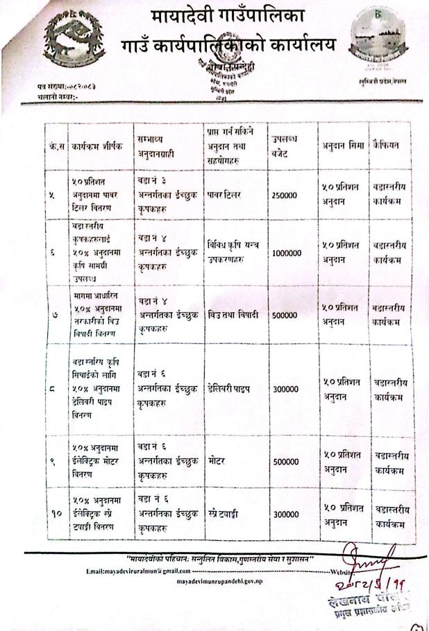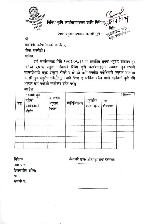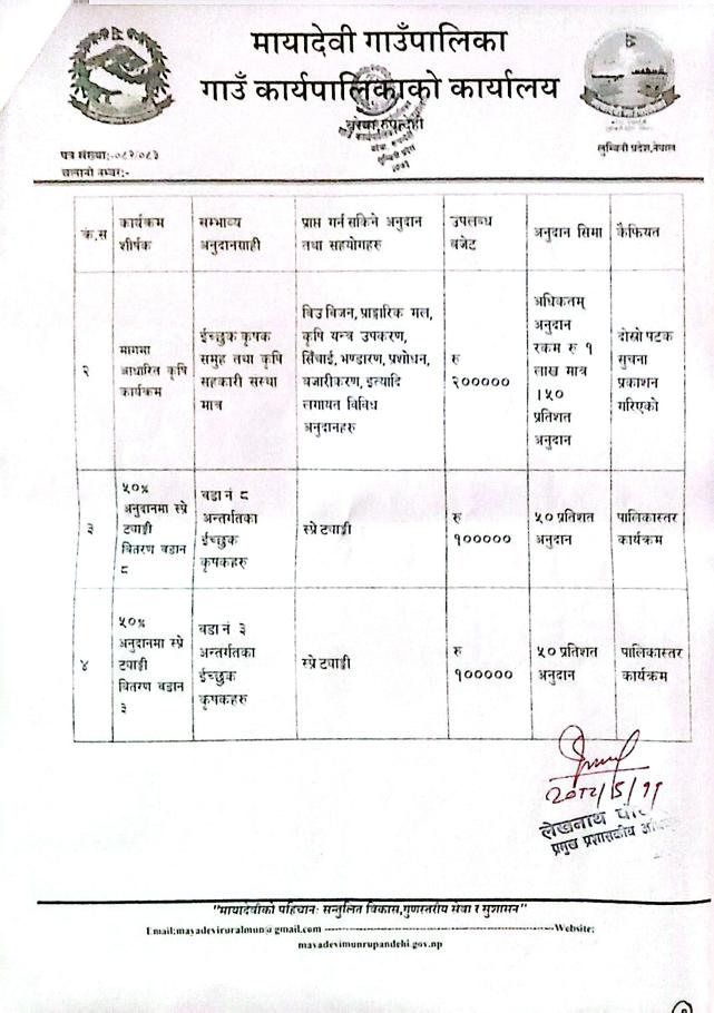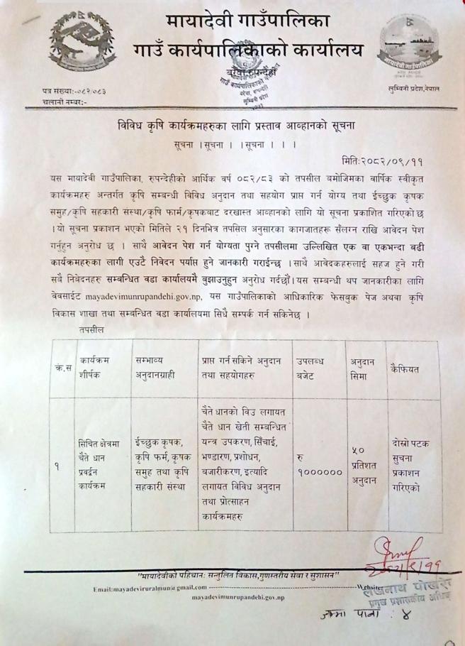 » विविध कृषि कार्यक्रमहरुका लागि प्रस्ताव आव्हानको सूचना - मायादेवी गाउँपालिका, बरेवा - रुपन्देही ।