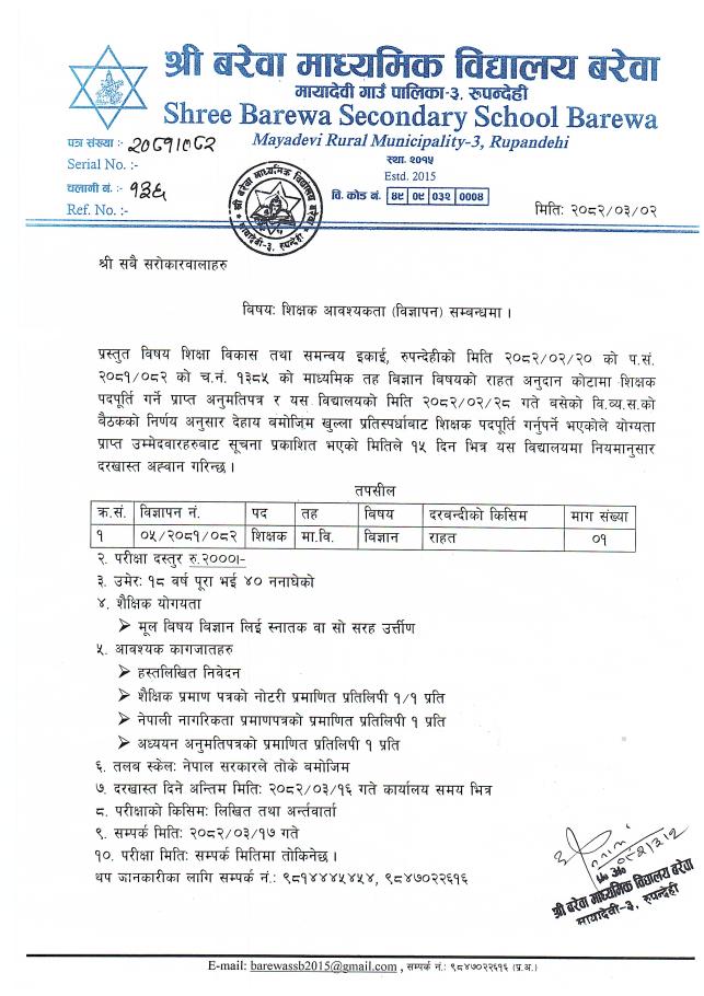 शिक्षक आवश्यकता (विज्ञापन) सम्बन्धमा - श्री बरेवा माध्यमिक विद्यालय, बरेवा-रुपन्देही ।