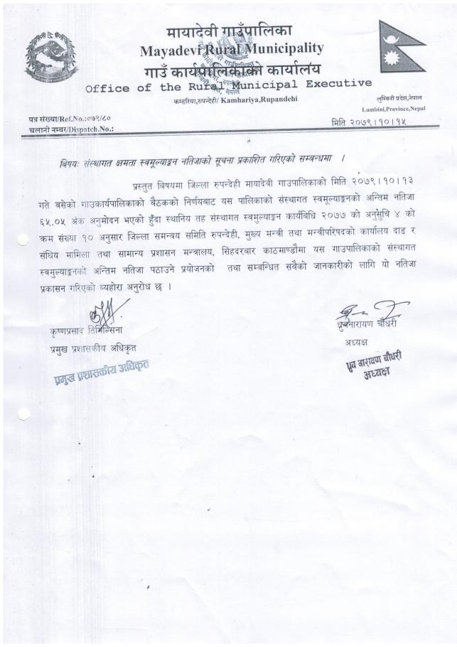 संस्थागत क्षमता स्व-मूल्याङ्कन नतिजाको सूचना प्रकाशित गरिएको सम्बन्धमा - मायादेवी गाउँपालिका,रुपन्देही ।