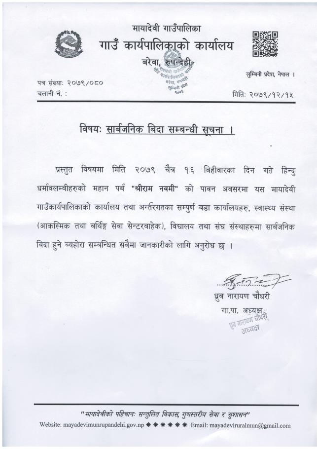 सार्वजनिक बिदा सम्बन्धी सूचना - मायादेवी गाउँपालिका,बरेवा-रुपन्देही ।