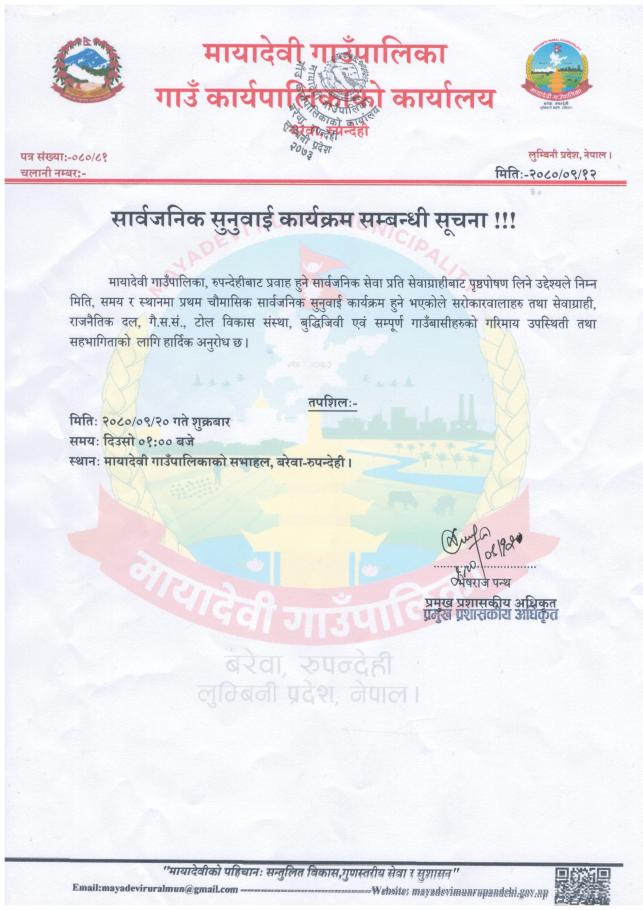 सार्वजनिक सुनुवाइ सम्बन्धमा - मायादेवी गाउँपालिका, बरेवा-रुपन्देही ।